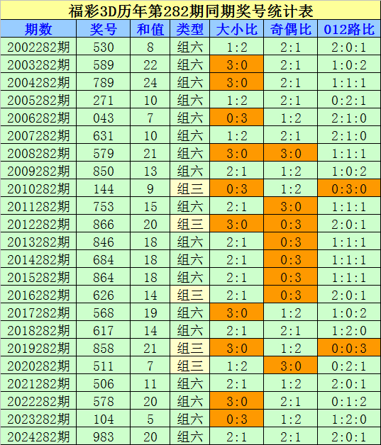 号码频次:在第282期历史同时开奖中,号码0-9出现频次差异为:号码2出现2个,号码9出现4个,号码0、3出现5个,号码7出现6个,号码1、4出现7个,号码5出现10个,号码6出现11个,号码8出现12个,本年同时绝杀一码3,独胆看好5。 012路比保举:在第282期历史同时开奖中,奖号012路个数总比例为25:20:24,奖号012路轮空期数比为5:9:5,本年同时提防0路号码走冷轮空,祥和012路比为0:2:1。 大小比保举:在第282期历史同时开奖中,大小比0:3出现3次,大小比1:2出现4次,大小比3:0出现7次,大小比2:1出现9次,奖号大小总比例为43:26,小 号开出比例较低,本年同时重防小 号回补转热,瞻望开出大小比1:2。 奇偶比保举:在第282期历史同时开奖中,奇偶比3:0开出3次,奇偶比0:3开出5次,奇偶比1:2开出7次,奇偶比2:1开出8次,奇偶奖号总个数比32:37,奇数号码相对轻佻,本年同时合适祥和奇数号码回补,参考奇偶比2:1。 组选类型判断:在第282期历史同时开奖中,组六开出18次,组三开出5次,本年同时看好开出组六号码。
